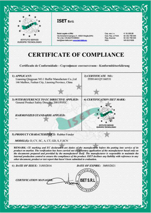 我们公司生产的缓冲器产品受到国际用户的认可,同时获得CE 国际认证证书、BV 国际检测认证、PIANC会员证书、中国船级社认证证书、SGS国际认证证书等。同时,我们公司荣获中国港口码头链商俱乐部会员、世界杰出华商协会会员、中国制造网认证供应商等荣誉。